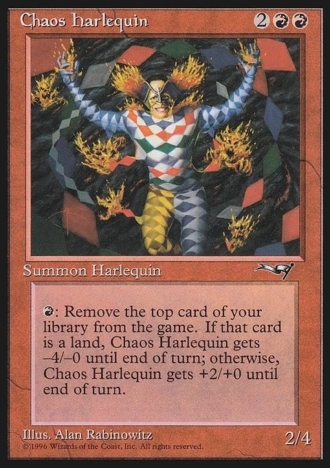 R: Remove the top card of your library from the game. If that card is a land, Chaos Harlequin gets -4/-0 until end of turn; otherwise, Chaos Harlequin gets +2/+0 until end of turn.