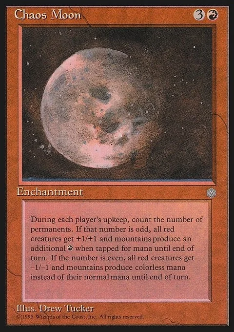 During each player’s upkeep, count the number of permanents. If that number is odd, all red creatures get +1/+1 and mountains produce an additional R when tapped for mana until end of turn. If the number is even, all red creatures get -1/-1 and mountains produce colorless mana instead of their normal mana until end of turn.