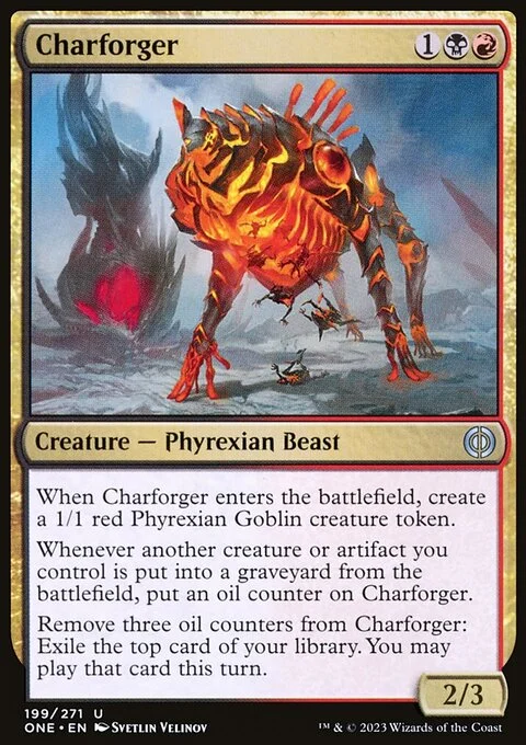 When this creature enters, create a 1/1 red Phyrexian Goblin creature token.