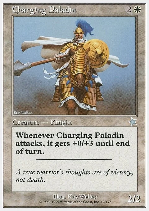 Whenever Charging Paladin attacks, it gets +0/+3 until end of turn.