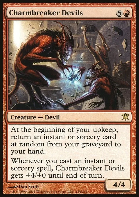 At the beginning of your upkeep, return an instant or sorcery card at random from your graveyard to your hand. Whenever you cast an instant or sorcery spell, Charmbreaker Devils gets +4/+0 until end of turn.