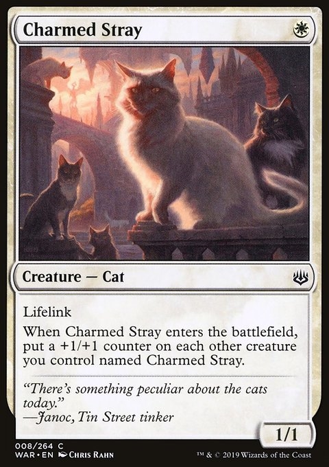 Lifelink When this creature enters, put a +1/+1 counter on each other creature you control named Charmed Stray.