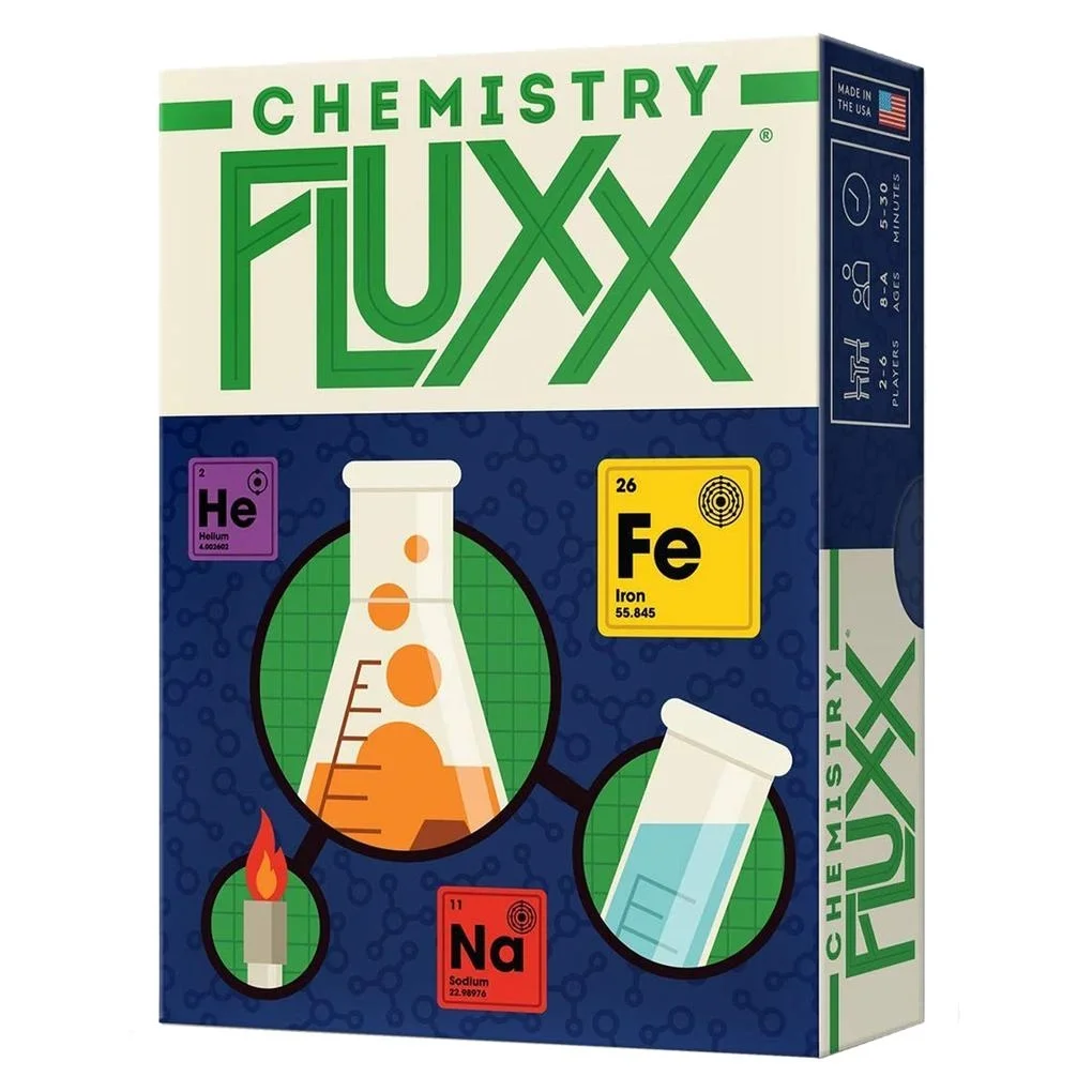 Chemistry Fluxx is the elemental card game in which the rules are always changing. Use atoms and laboratory gear to match the current goal and win! Chemistry Fluxx is the perfect compound of chance and skill in which you'll not only be playing with elements and molecules, but you'll also be learning about them!