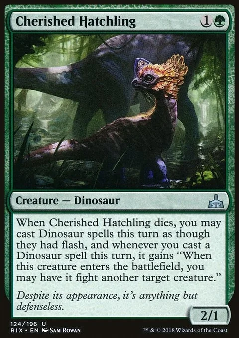 When Cherished Hatchling dies, you may cast Dinosaur spells this turn as though they had flash, and whenever you cast a Dinosaur spell this turn, it gains "When this creature enters the battlefield, you may have it fight another target creature."