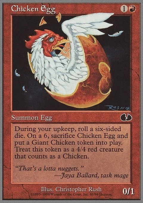 At the beginning of your upkeep, roll a six-sided die. If you roll a 6, sacrifice this creature and create a 4/4 red Giant Bird creature token.