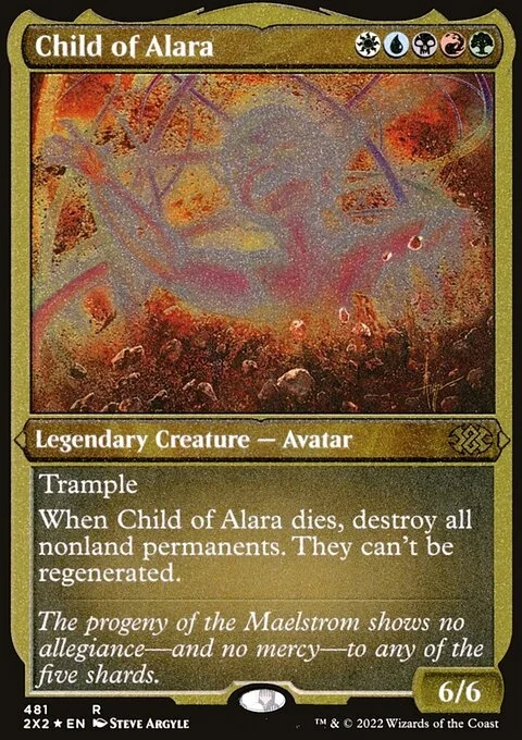 Trample When Child of Alara dies, destroy all nonland permanents. They can't be regenerated.