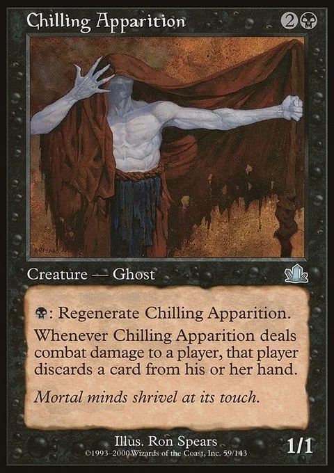 {B}: Regenerate Chilling Apparition. Whenever Chilling Apparition deals combat damage to a player, that player discards a card.