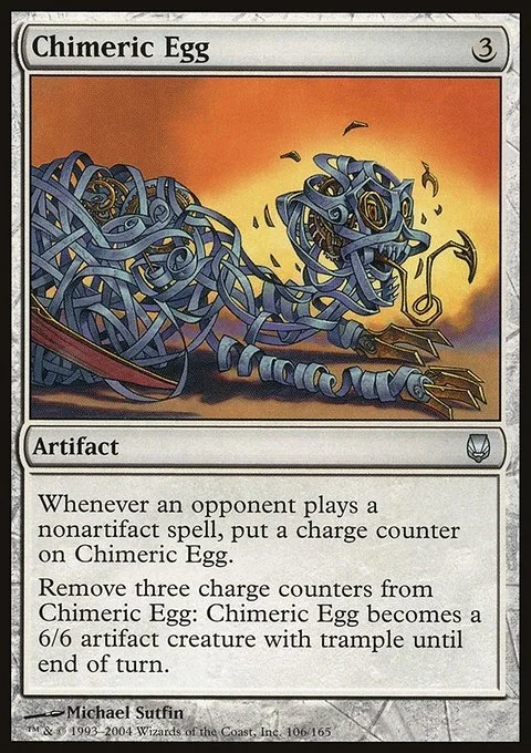 Whenever an opponent casts a nonartifact spell, put a charge counter on Chimeric Egg. Remove three charge counters from Chimeric Egg: Chimeric Egg becomes a 6/6 Construct artifact creature with trample until end of turn.