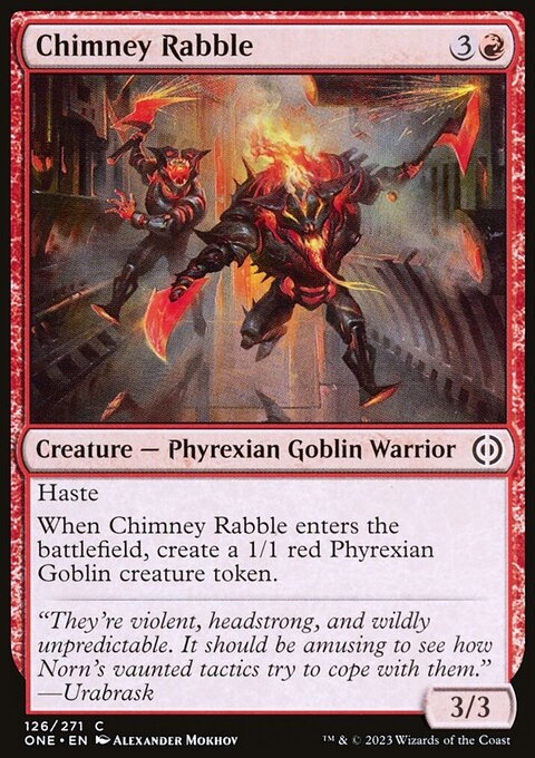 Haste When this creature enters, create a 1/1 red Phyrexian Goblin creature token.