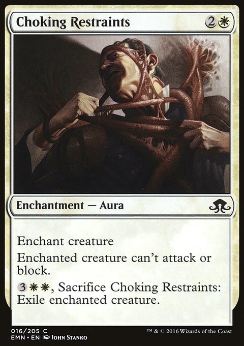 Enchant creature Enchanted creature can't attack or block. {3}{W}{W}, Sacrifice this Aura: Exile enchanted creature.