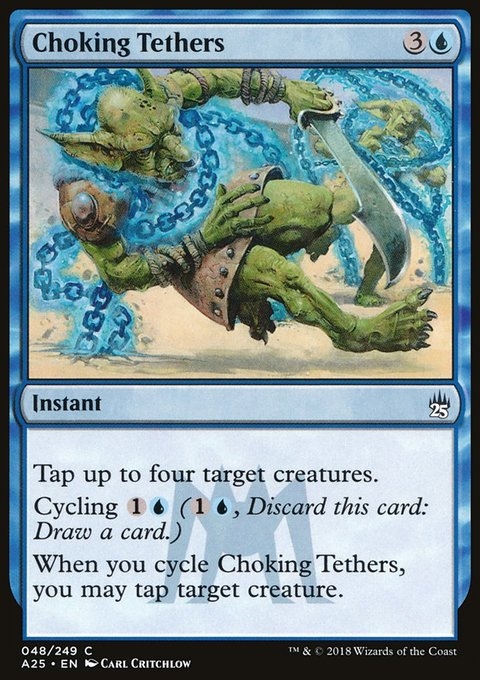 Tap up to four target creatures. Cycling {1}{U} ({1}{U}, Discard this card: Draw a card.) When you cycle Choking Tethers, you may tap target creature.