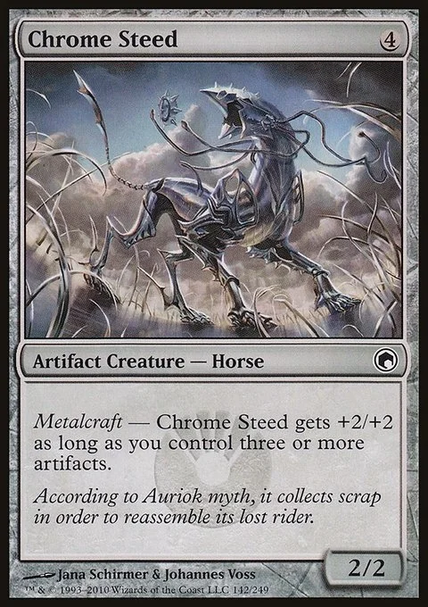 Metalcraft — Chrome Steed gets +2/+2 as long as you control three or more artifacts.