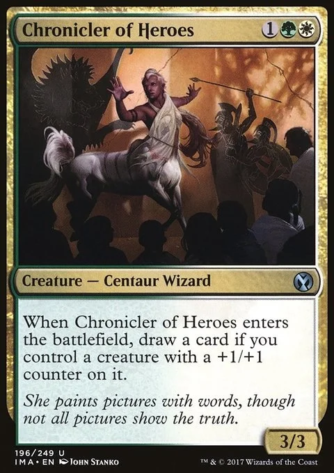 When Chronicler of Heroes enters the battlefield, draw a card if you control a creature with a +1/+1 counter on it.
