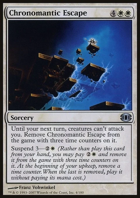 Until your next turn, creatures can't attack you. Remove Chronomantic Escape from the game with three time counters on it.