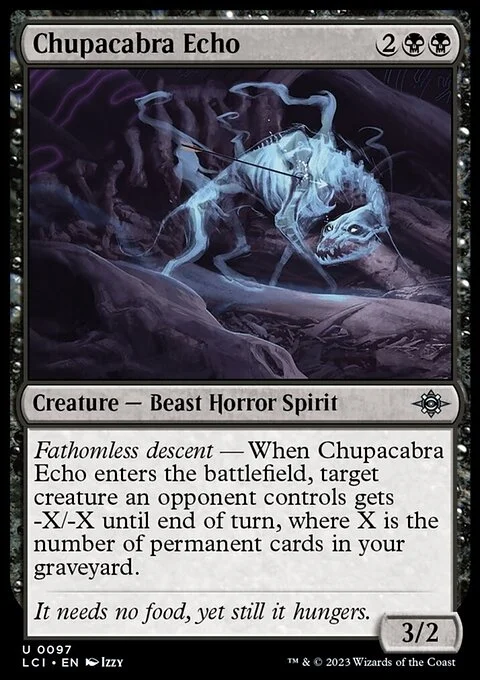 Fathomless descent — When Chupacabra Echo enters the battlefield, target creature an opponent controls gets -X/-X until end of turn, where X is the number of permanent cards in your graveyard.