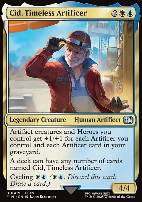Artifact creatures and Heroes you control get +1/+1 for each Artificer you control and each Artificer card in your graveyard. A deck can have any number of cards named Cid, Timeless Artificer. Cycling {W}{U} ({W}{U}, Discard this card: Draw a card.)