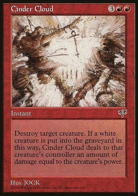 Destroy target creature. If a white creature is put into the graveyard in this way, Cinder Cloud deals to that creature’s controller an amount of damage equal to the creature’s power.