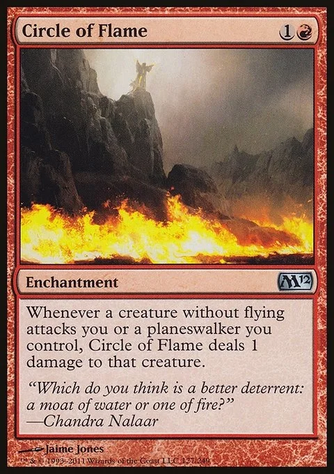Whenever a creature without flying attacks you or a planeswalker you control, Circle of Flame deals 1 damage to that creature.