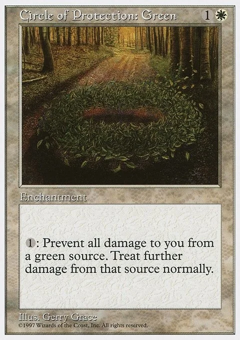 {1}: The next time a green source of your choice would deal damage to you this turn, prevent that damage.