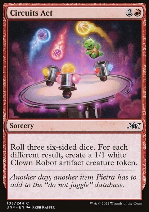 Roll three six-sided dice. For each different result, create a 1/1 white Clown Robot artifact creature token.