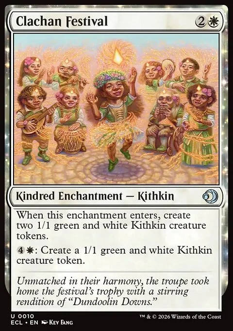 When this enchantment enters, create two 1/1 green and white Kithkin creature tokens. {4}{W}: Create a 1/1 green and white Kithkin creature token.