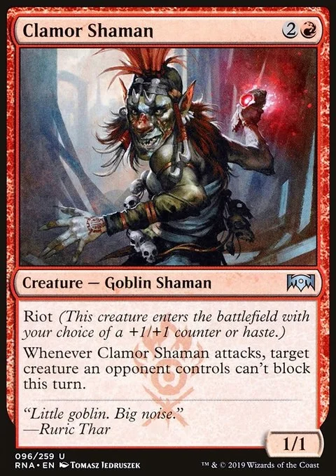 Riot (This creature enters the battlefield with your choice of a +1/+1 counter or haste.) Whenever Clamor Shaman attacks, target creature an opponent controls can't block this turn.