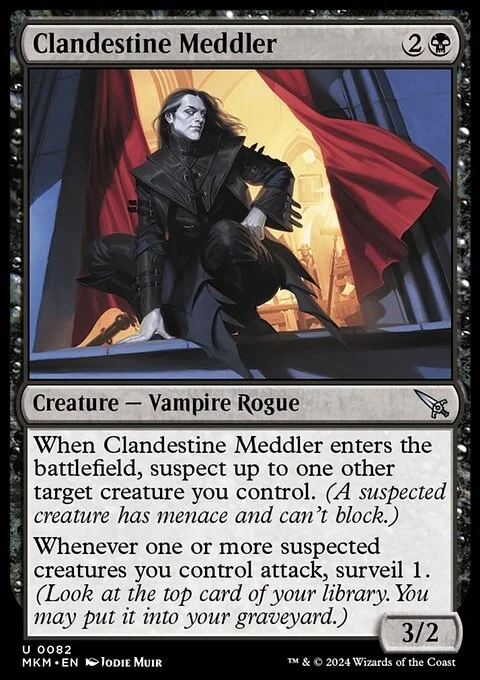 When Clandestine Meddler enters the battlefield, suspect up to one other target creature you control. (A suspected creature has menace and can't block.)