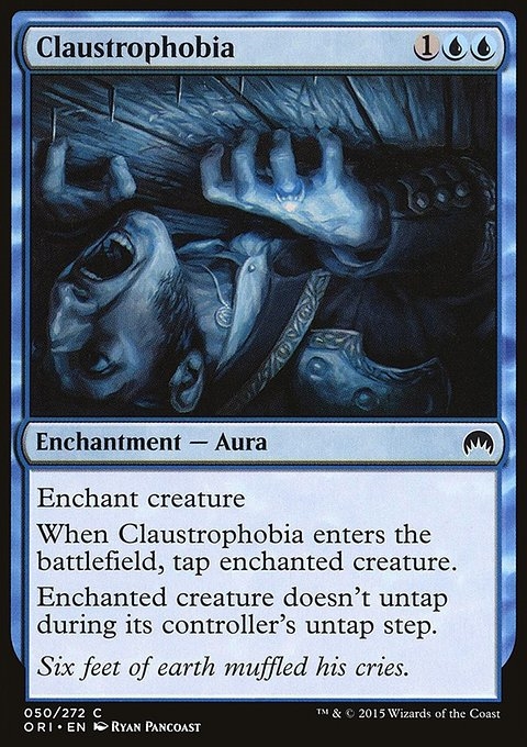 Enchant creature When Claustrophobia enters the battlefield, tap enchanted creature. Enchanted creature doesn't untap during its controller's untap step.