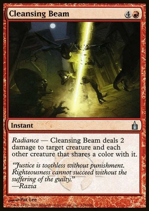 Radiance — Cleansing Beam deals 2 damage to target creature and each other creature that shares a color with it.