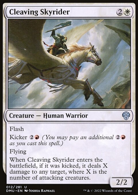 Flash Kicker {2}{R} (You may pay an additional {2}{R} as you cast this spell.) Flying When Cleaving Skyrider enters the battlefield, if it was kicked, it deals X damage to any target, where X is the number of attacking creatures.