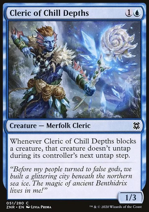Whenever Cleric of Chill Depths blocks a creature, that creature doesn't untap during its controller's next untap step.