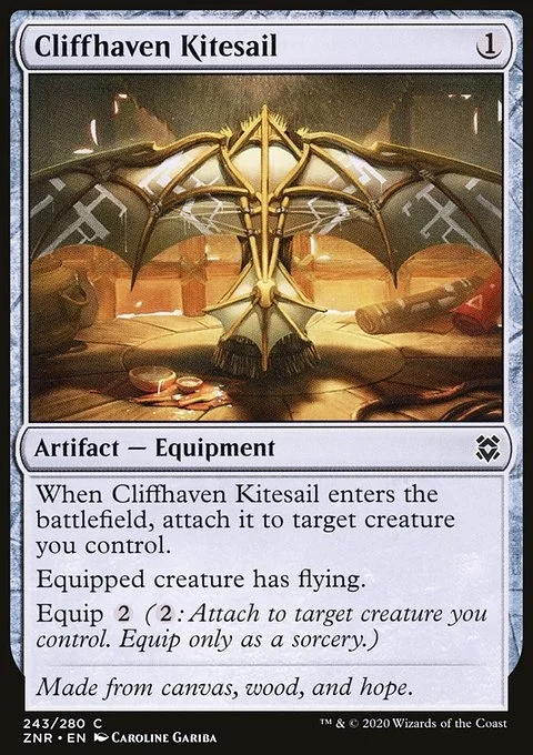 When Cliffhaven Kitesail enters the battlefield, attach it to target creature you control. Equipped creature has flying. Equip {2} ({2}: Attach to target creature you control. Equip only as a sorcery.)