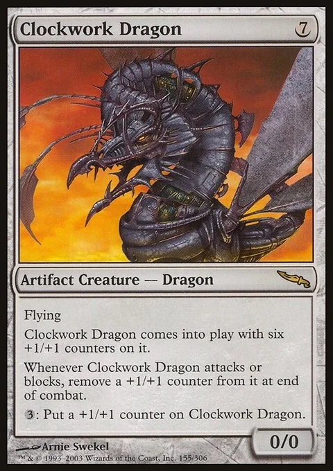 Flying Clockwork Dragon enters the battlefield with six +1/+1 counters on it. Whenever Clockwork Dragon attacks or blocks, remove a +1/+1 counter from it at end of combat. {3}: Put a +1/+1 counter on Clockwork Dragon.