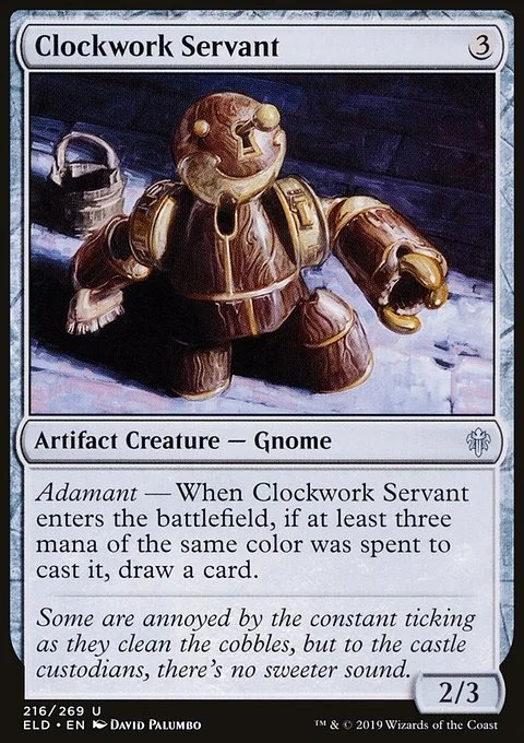 Adamant — When Clockwork Servant enters the battlefield, if at least three mana of the same color was spent to cast it, draw a card.