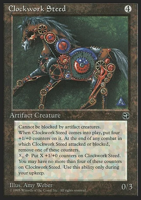 {X}, {T}: Put up to X +1/+0 counters on Clockwork Steed. This ability can't cause the total number of +1/+0 counters on Clockwork Steed to be greater than four. Activate only during your upkeep.