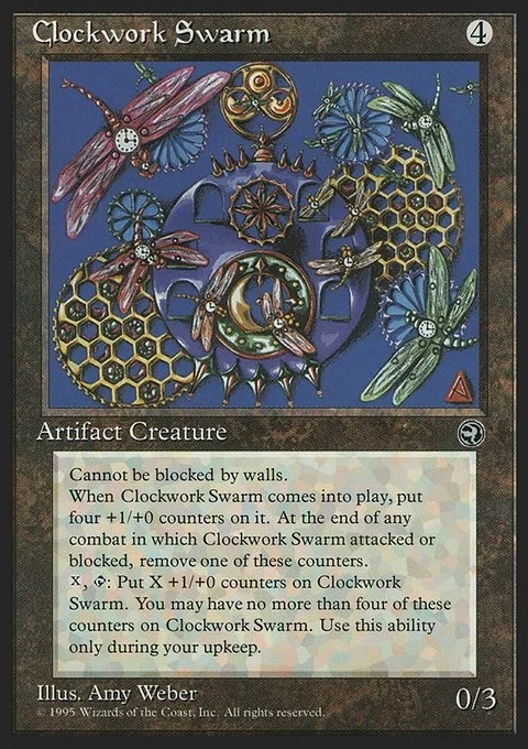 Clockwork Swarm enters the battlefield with four +1/+0 counters on it.