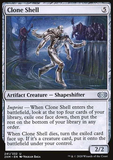 Imprint — When Clone Shell enters the battlefield, look at the top four cards of your library, exile one face down, then put the rest on the bottom of your library in any order.