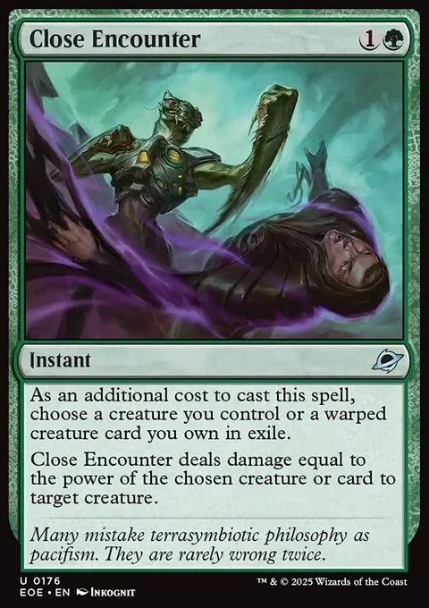 As an additional cost to cast this spell, choose a creature you control or a warped creature card you own in exile. Close Encounter deals damage equal to the power of the chosen creature or card to target creature.