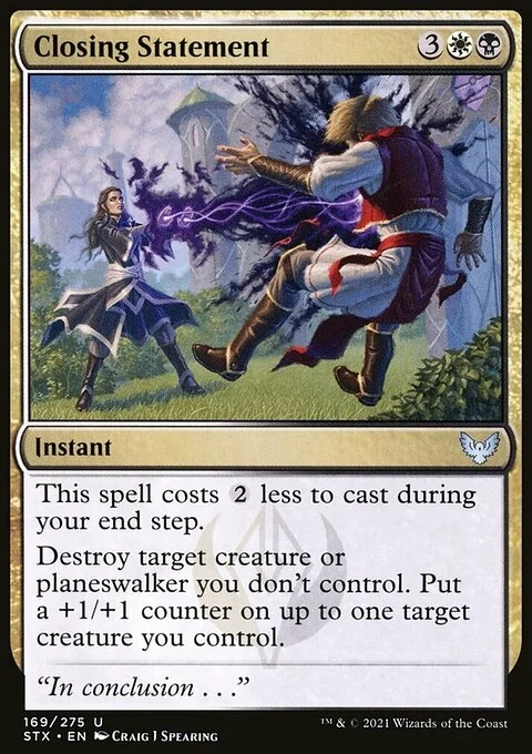 This spell costs {2} less to cast during your end step. Destroy target creature or planeswalker you don't control. Put a +1/+1 counter on up to one target creature you control.