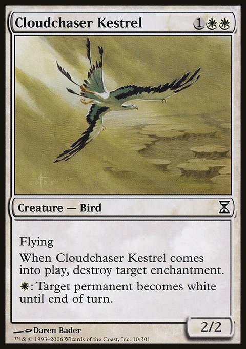 Flying When Cloudchaser Kestrel enters, destroy target enchantment. {W}: Target permanent becomes white until end of turn.