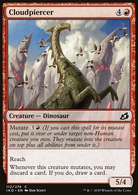 Mutate {3}{R} (If you cast this spell for its mutate cost, put it over or under target non-Human creature you own. They mutate into the creature on top plus all abilities from under it.) Reach Whenever this creature mutates, you may discard a card. If you do, draw a card.