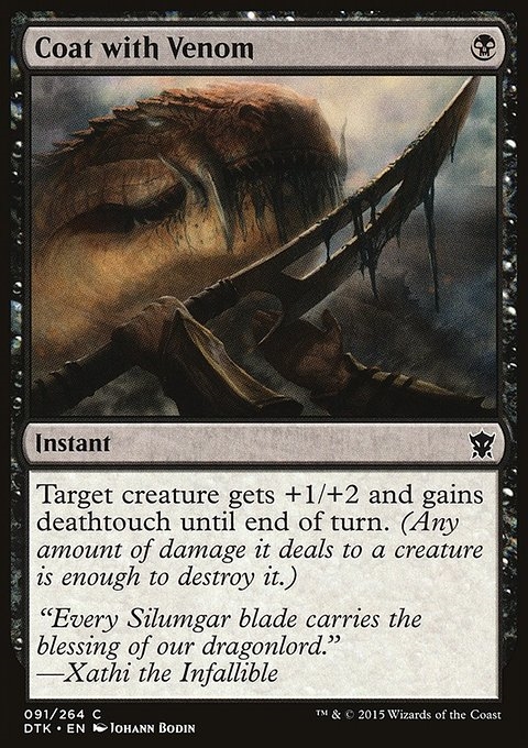Target creature gets +1/+2 and gains deathtouch until end of turn. (Any amount of damage it deals to a creature is enough to destroy it.)