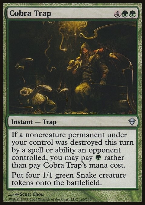 If a noncreature permanent under your control was destroyed this turn by a spell or ability an opponent controlled, you may pay {G} rather than pay this spell's mana cost. Create four 1/1 green Snake creature tokens.