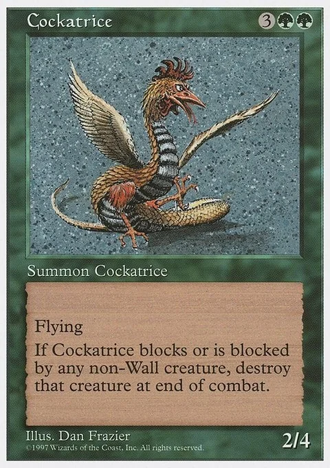 FlyingIf Cockatrice blocks or is blocked by any non-Wall creature, destroy that creature at end of combat.