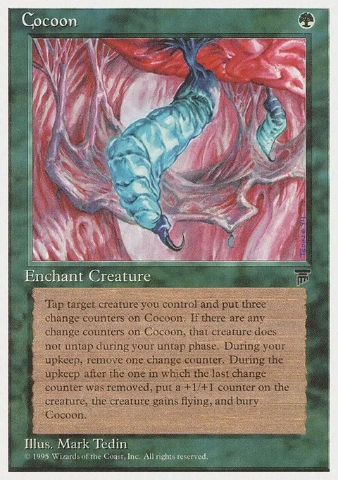 Tap target creature you control and put three change counters on Cocoon. If there are any change counters on Cocoon, that creature does not untap during your untap phase. During your upkeep, remove one change counter. During the upkeep after the one in which the last change counter was removed, put a +1/+1 counter on the creature, the creature gains flying, and bury Cocoon.