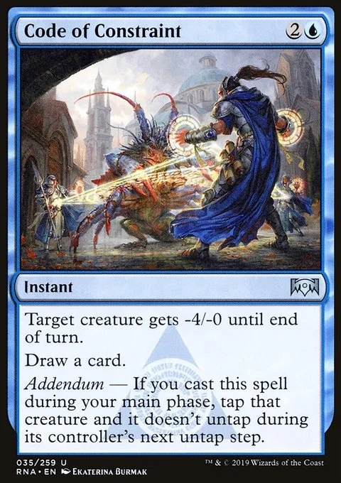 Target creature gets -4/-0 until end of turn. Draw a card. Addendum — If you cast this spell during your main phase, tap that creature and it doesn't untap during its controller's next untap step.