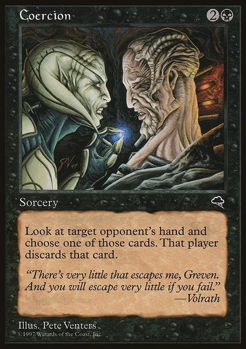 Target opponent reveals their hand. You choose a card from it. That player discards that card.