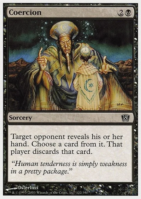 Target opponent reveals their hand. You choose a card from it. That player discards that card.