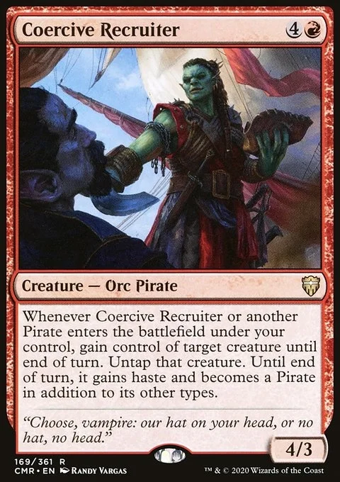 Whenever Coercive Recruiter or another Pirate enters the battlefield under your control, gain control of target creature until end of turn. Untap that creature. Until end of turn, it gains haste and becomes a Pirate in addition to its other types.