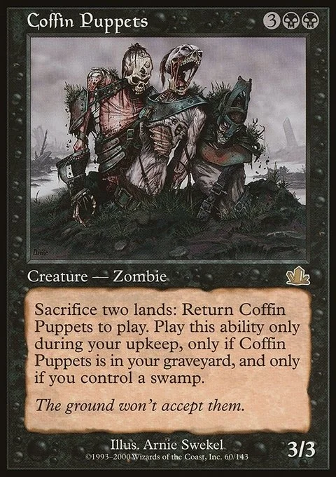 Sacrifice two lands: Return Coffin Puppets from your graveyard to the battlefield. Activate only during your upkeep and only if you control a Swamp.